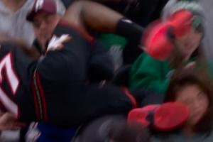 GIF-埃奇库姆救球不小心踢到女球迷 后者直接挂彩 VJ赶紧来抱抱安慰下