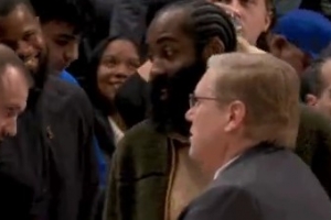 GIF-活塞主场音响设备出问题 哈登场边热聊