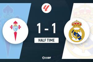 半场-皇马暂1-1塞尔塔 琼阿梅尼联赛首球阿诺德边路被爆致丢球